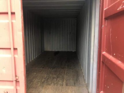 Container marittimo Open Top da 40 piedi usato o di seconda mano, modificato. Convertito da un container DV standard da 40 piedi in un container Open Top. Lungo 12 metri, adatto al carico dall’alto o frontale. Dotato di chiusura in telone e barre trasversali.
