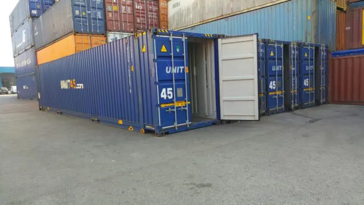 Questo container per spedizioni High Cube Pallet Wide usato da 45 piedi è lungo 13,72 metri e ha una doppia porta su uno dei lati corti.